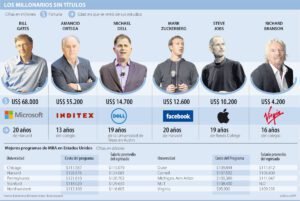 Existen diversos ejemplos de multimillonarios exitosos que han logrado cambiar el mundo sin siquiera haber obtenido un título universitario, tal es el caso de Steve Jobs, Bill Gates y Mark Zuckerberg, incluso, algunos como Amancio Ortega, quien actualmente es el tercer hombre más rico del mundo, ni siquiera terminaron la escuela.